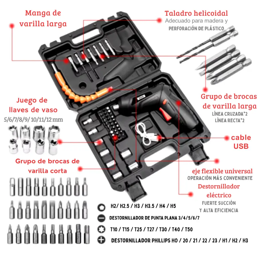 🔹 1 Destornillador Eléctrico Inalámbrico Recargable 🔹 46 accesorios en total, entre ellos: